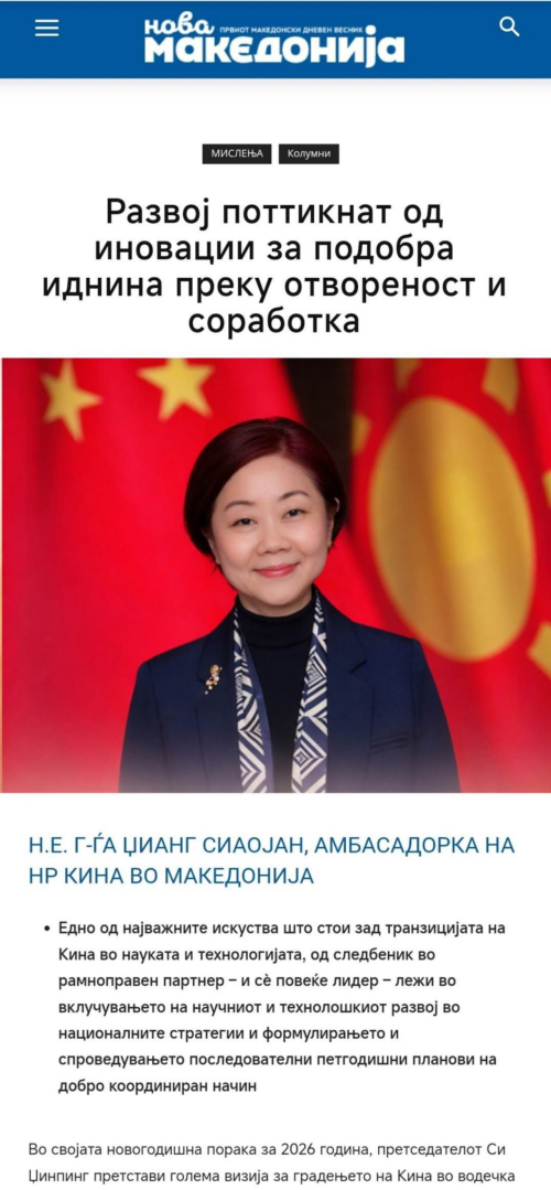 2026年2月7日,《新马其顿报》刊发驻马其顿大使蒋小燕署名文章《科技创新引领高质量发展 开放合作助力美好未来》,全文如下: